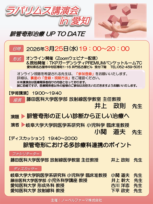 2026年3月25日(水)19:00~20:00NEWラパリムス講演会 in 愛知脈管奇形治療 UP TO DATEオンライン開催(Zoomウェビナー配信)